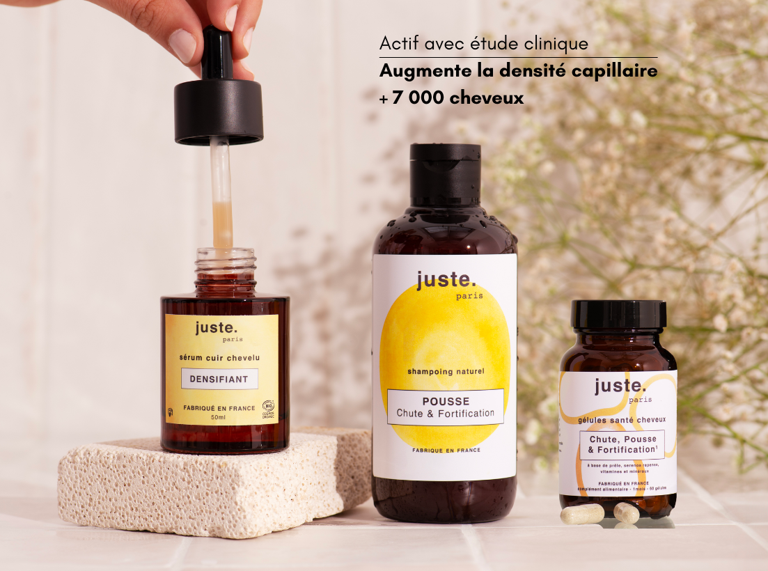 Cela fait 2-3 semaines que j'utilise le sérum fortifiant de chez Juste. Il est sans doute trop tôt pour constater un effet sur la pousse et la chute, cependant, je remarque que mon cuir chevelu graisse beaucoup moins en utilisant quotidiennement le sérum. A savoir que cela ne peut que être bénéfique pour contrer la chute des cheveux !